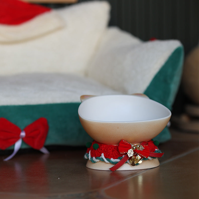 The bowl features a cute cat-face shape with 3D ears on the rim, while the inside is hand-painted with a tiny cat nose and whiskers 🐾 — as if your pet is eating straight from a kitty’s cheeks. The base is wrapped in festive Christmas-style knitted decor 🎄, accented with red & green yarn, a bow, and a tiny jingle bell 🔔, instantly creating a warm holiday vibe.